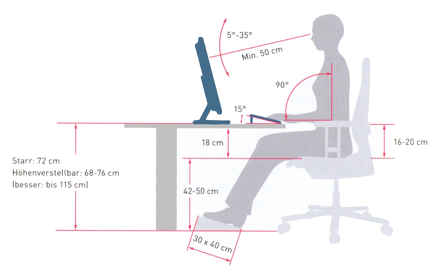 Langes Sitzen am Schreibtisch und Computer kann zu Rückenschmerzen führen und die Augen werden stark beansprucht. Um langfristigen Schäden vorzubeugen kann man seinen Arbeitsplatz gesundheitsfördernd einrichten. Nebenstehende Grafik zeigt den idealen Arbeitsplatz.